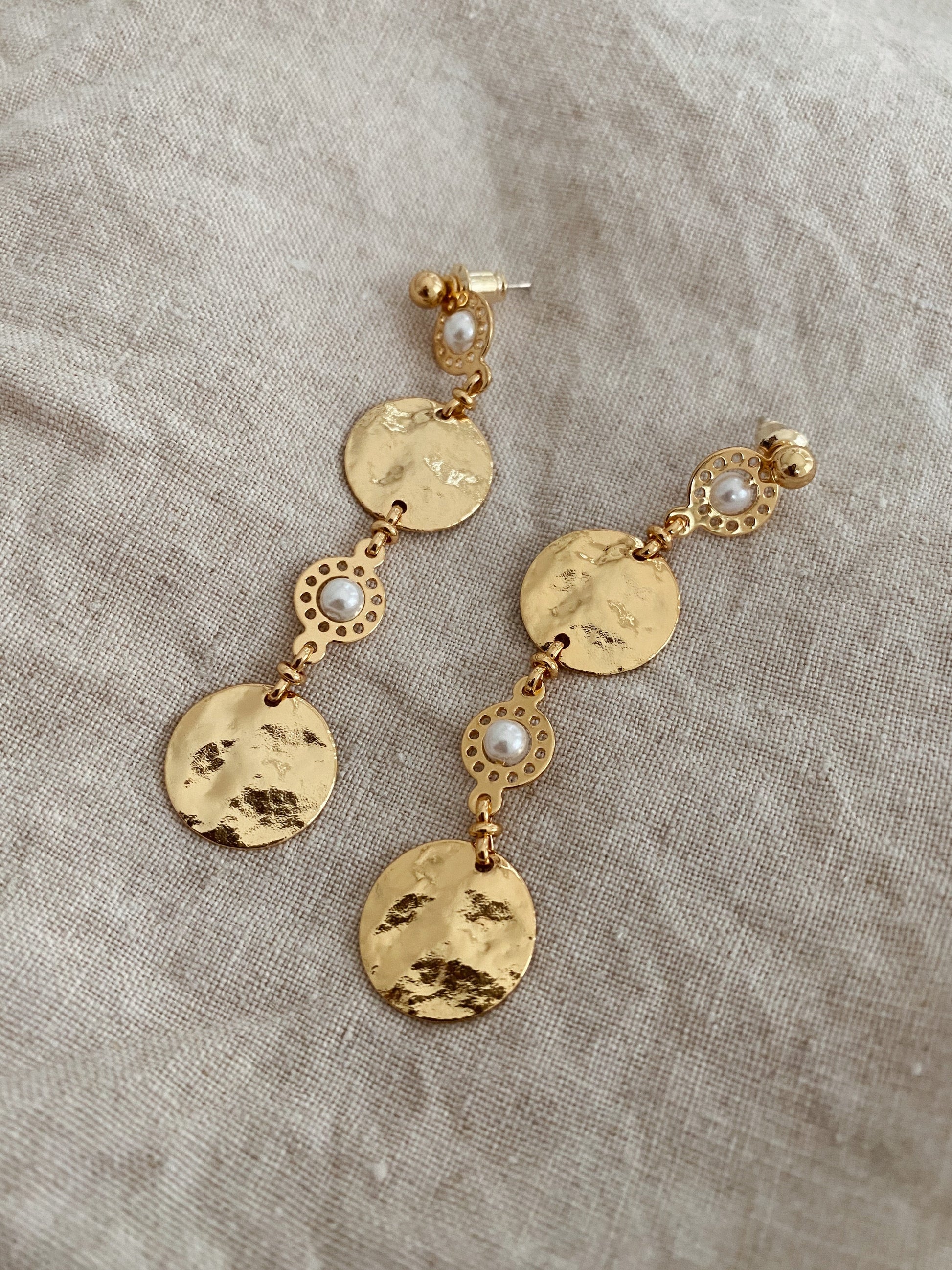 The Camille Drop Luxe Earrings by Kitsense are a part of the Luxe Edit Collection 0.4. These earrings are crafted from titanium steel and are a drop style featuring hammered discs and and pearl details.
