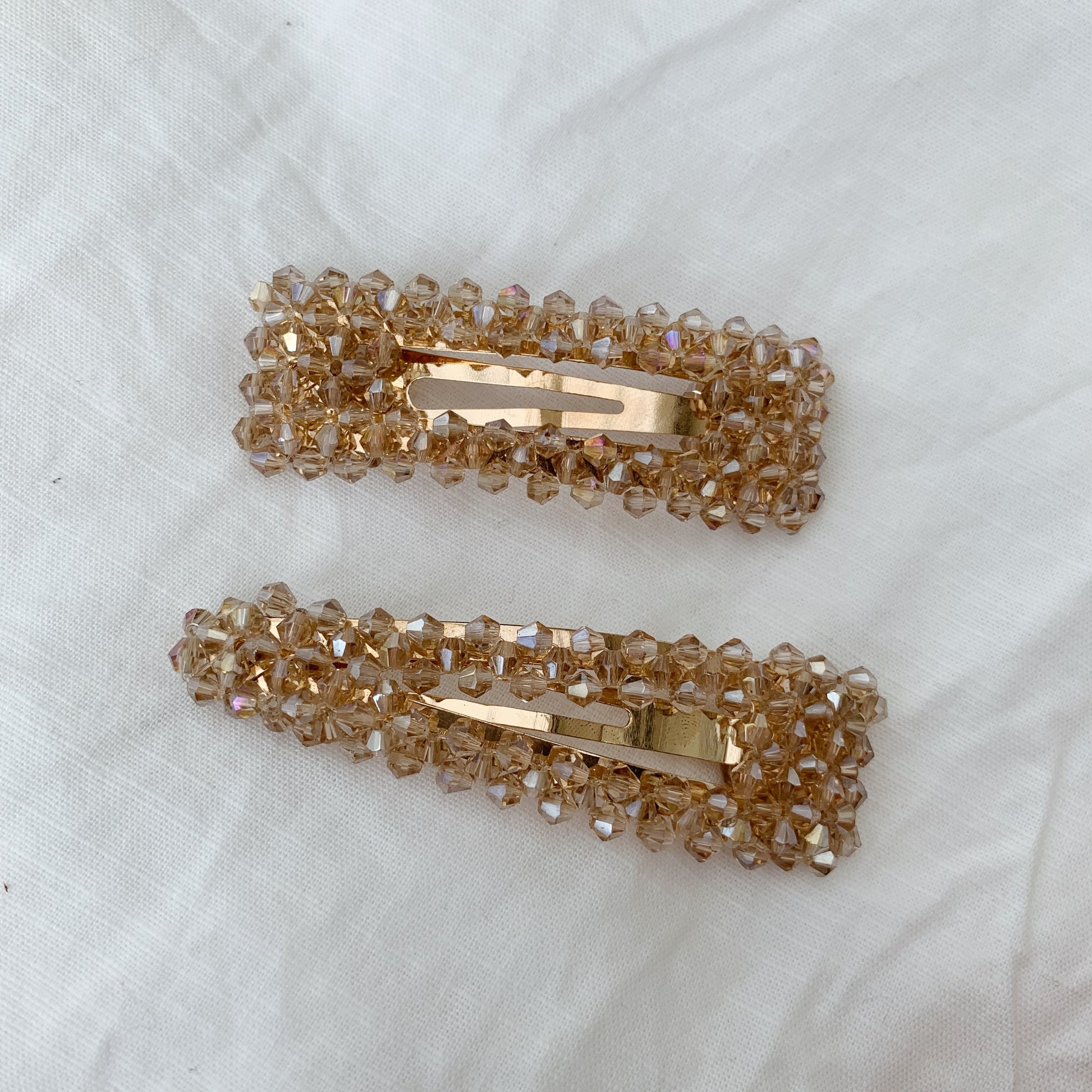 The Daisy hair clip by Kitsense is encrusted in pink champagne coloured crystal like detail and features a snap closure.