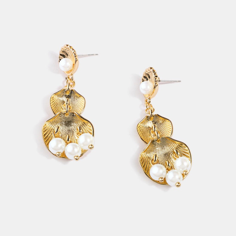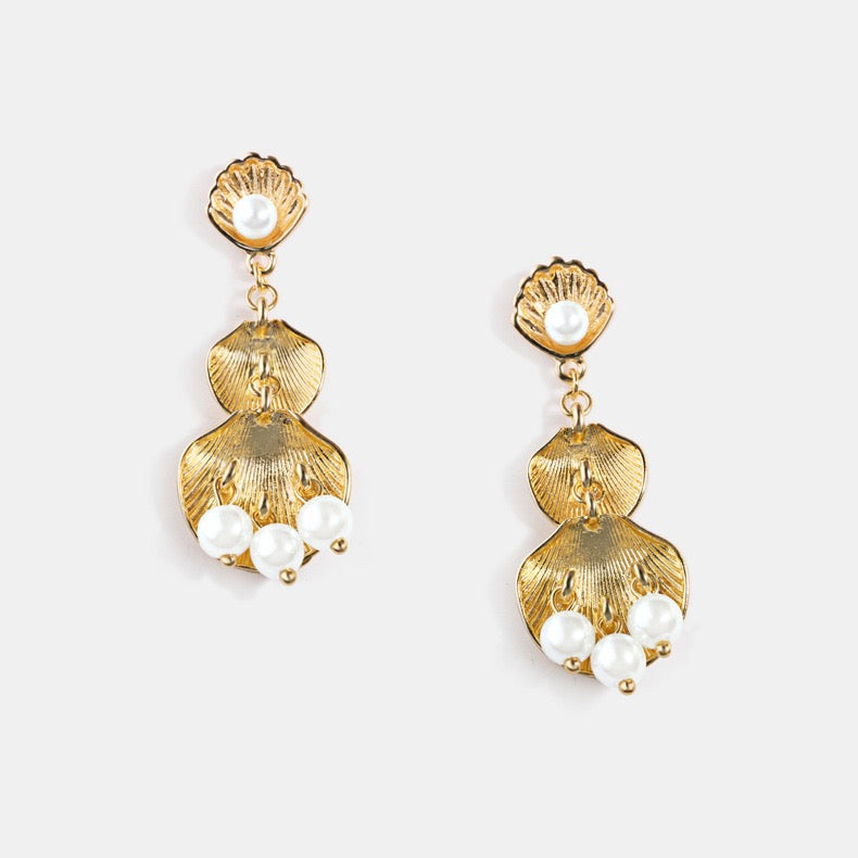 The Dakota earrings by Kitsense are a part of the Statement Earring collection 0.7. This style features a gold-toned shell shaped design with delicate pearl-look details featured over the piece.