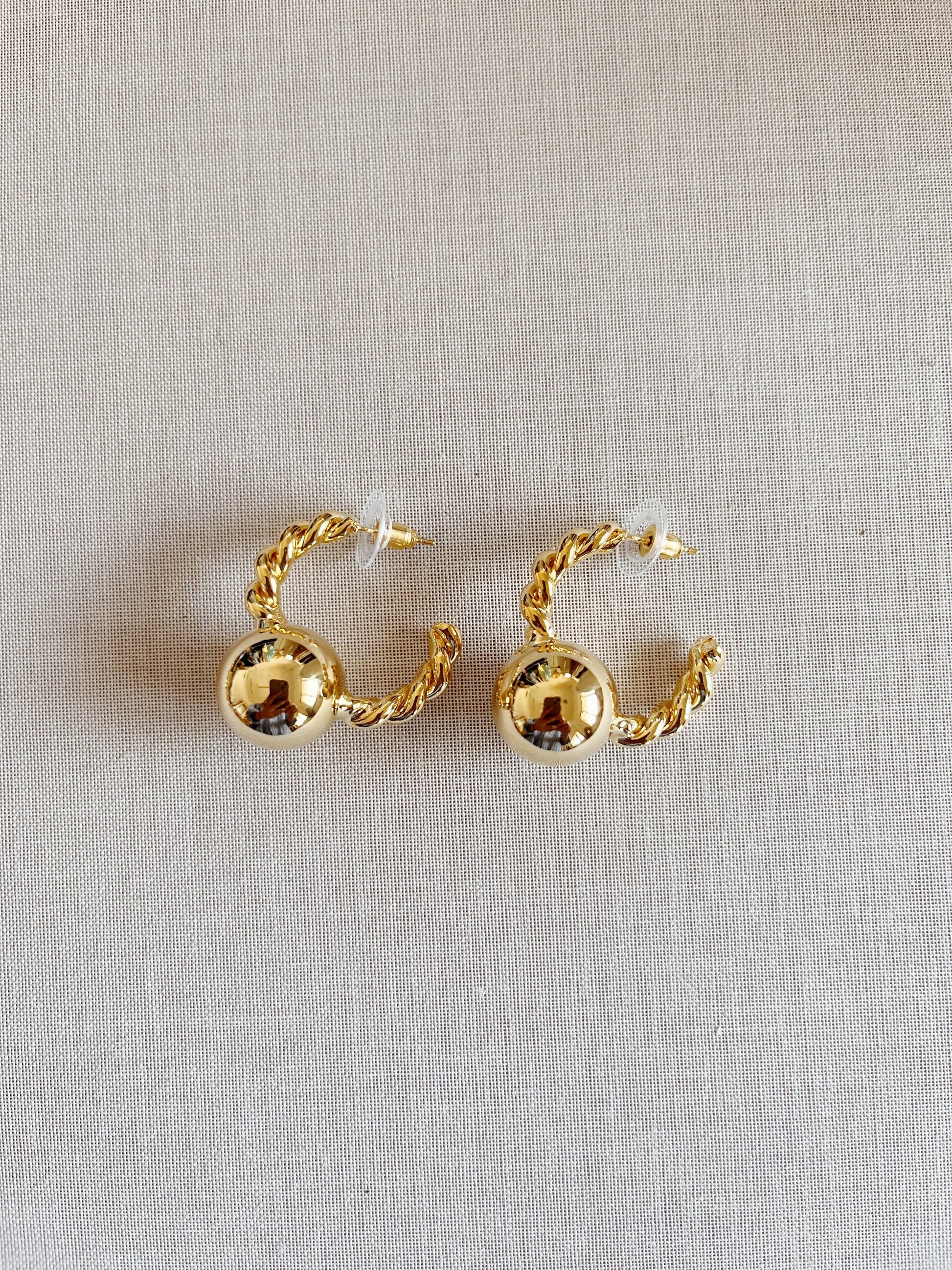 The Ellie Twisted Ball Hoop Earrings by Kitsense are a part of the Holiday Edit. These earrings feature a twisted chain hoop with a statement ball detail & stud back.