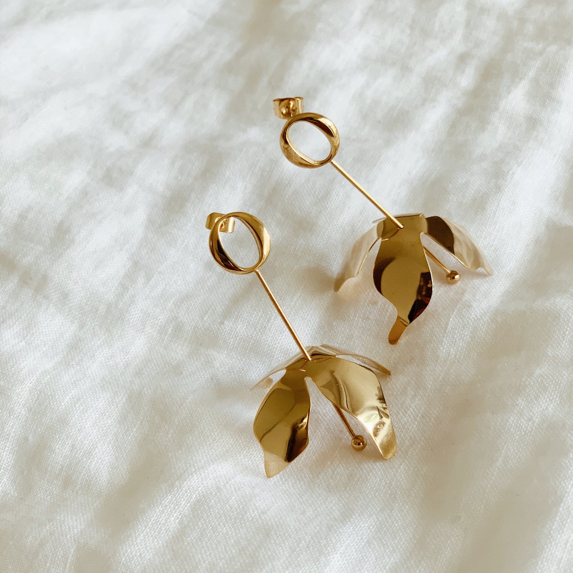 The Fleur Luxe Earrings by Kitsense are crafted from titanium steel and feature a delicate stem dropping down into an exquisite flower shape. This elegant and show stopping style is sure to turn heads.
