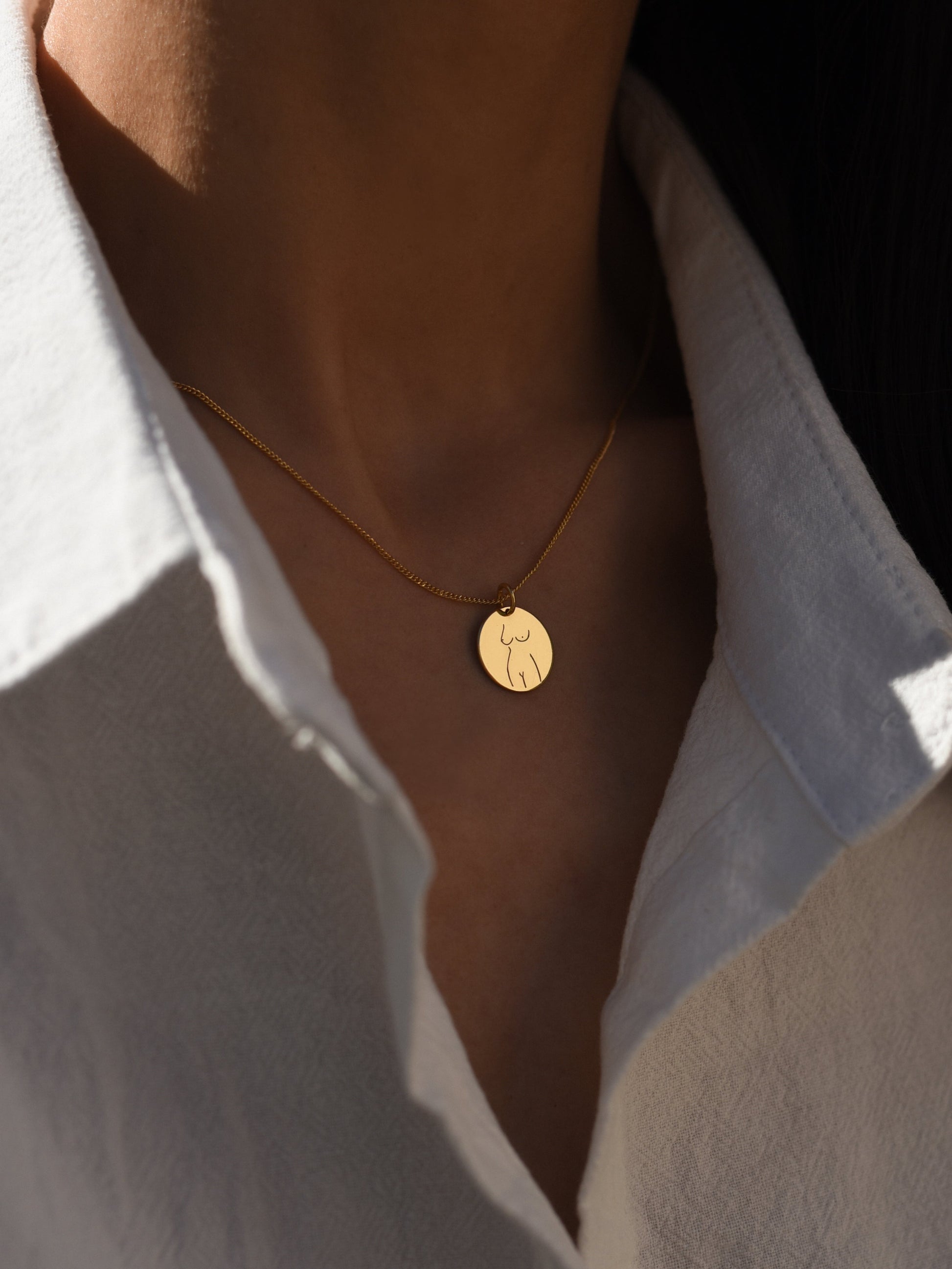 The Courage Necklace from the Portraits of Femininity collection by Kitsense x @writehand is inspired by what it means to embrace femininity in the modern world. A coin pendant etched with the outline of the female form raises themes of strength and courage, and delicately hangs from a fine gold chain. Cast from 18K coated over 925 Sterling Silver, each necklace is adorned with a tag embossed with ‘Kitsense’.