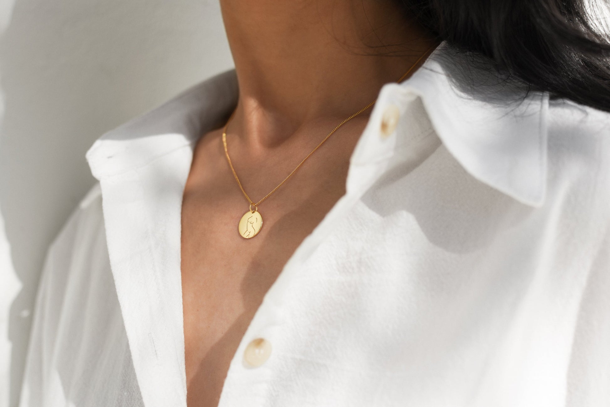 The Empowerment Necklace from the Portraits of Femininity collection by Kitsense x @writehand features a coin pendant etched with the provocative curvature of a woman. This simple yet meaningful necklace is inspired by themes of empowerment and body confidence. Featuring a fine gold chain, each piece is cast from 18K coated over 925 Sterling Silver and adorned with a tag embossed with ‘Kitsense’.
