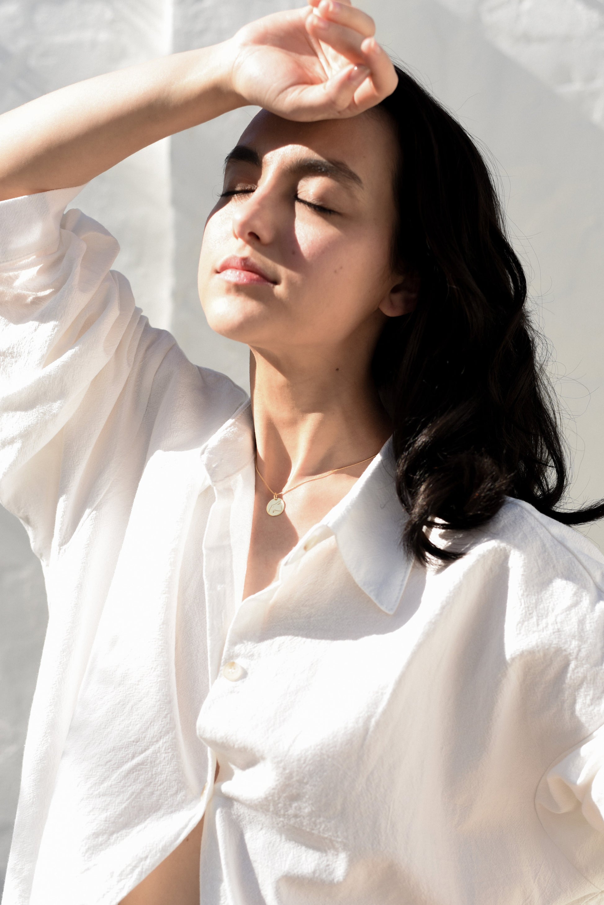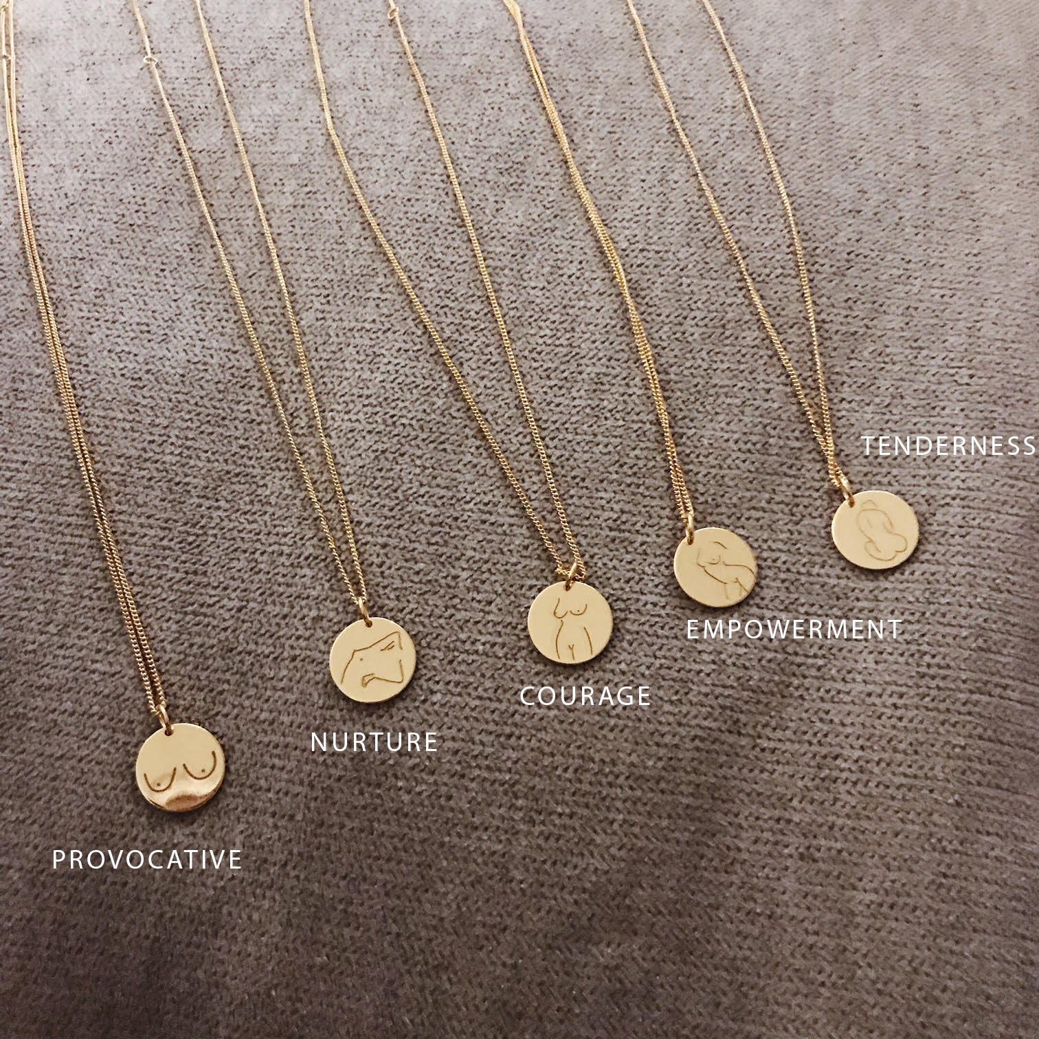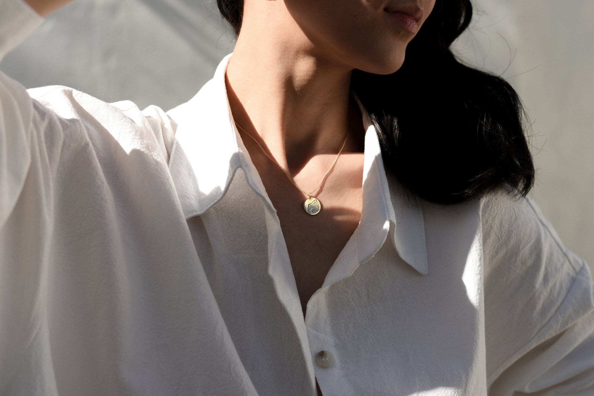 The Nurture Necklace from the Portraits of Femininity collection by Kitsense x @writehand evokes an exploration of motherhood and the nurturing instinct. A coin pendant etched with an abstract side profile of the female form delicately hangs from a fine chain, with each piece cast from 18K coated over 925 Sterling Silver. Each necklace is adorned with a tag embossed with ‘Kitsense’.