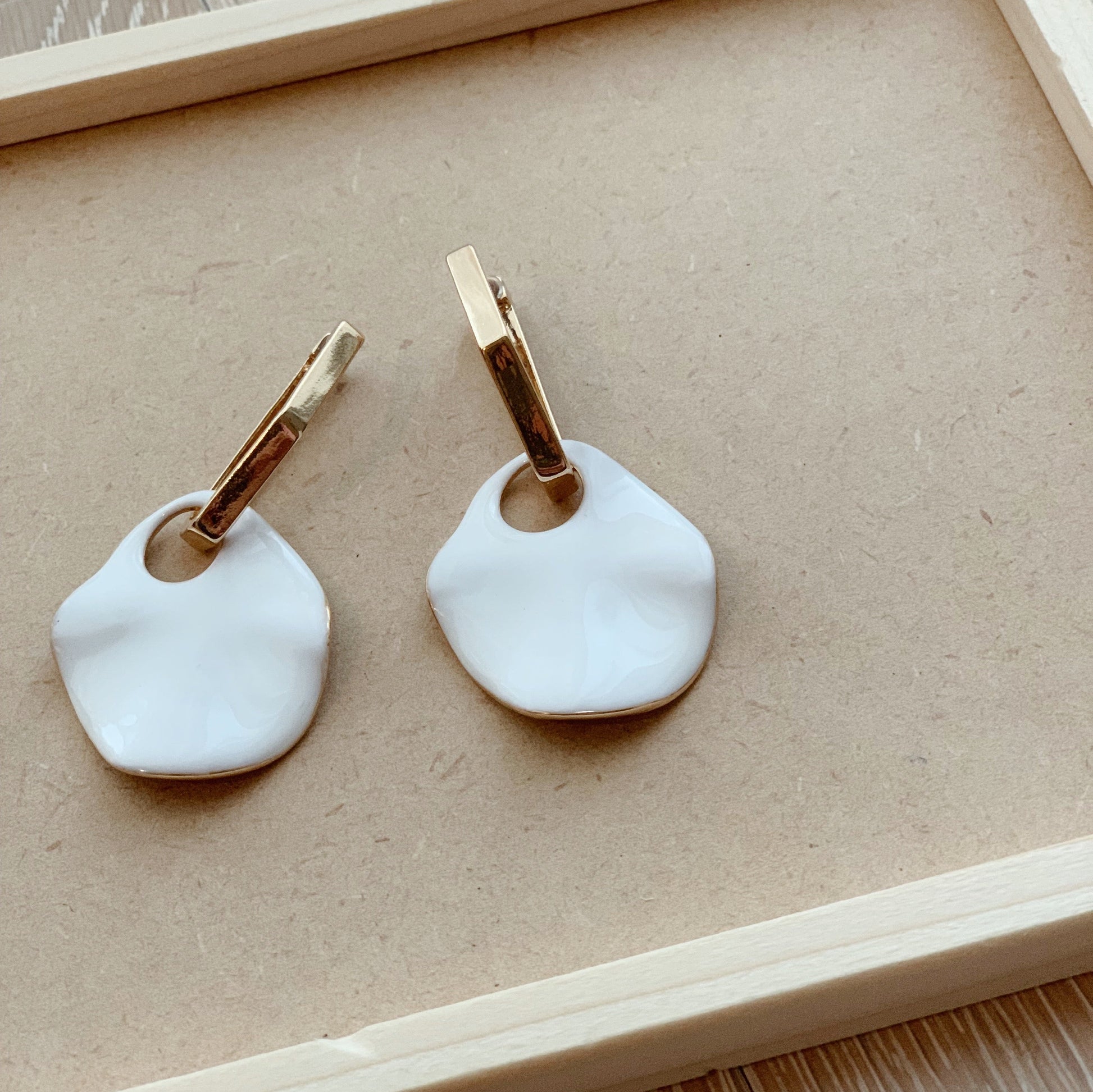 The Lara earrings by Kitsense are apart of the Statement Earring collection 0.5. This style features a gold and white toned irregular circle shape with a wave appearance. This style is a perfect mixture of statement and elegance.