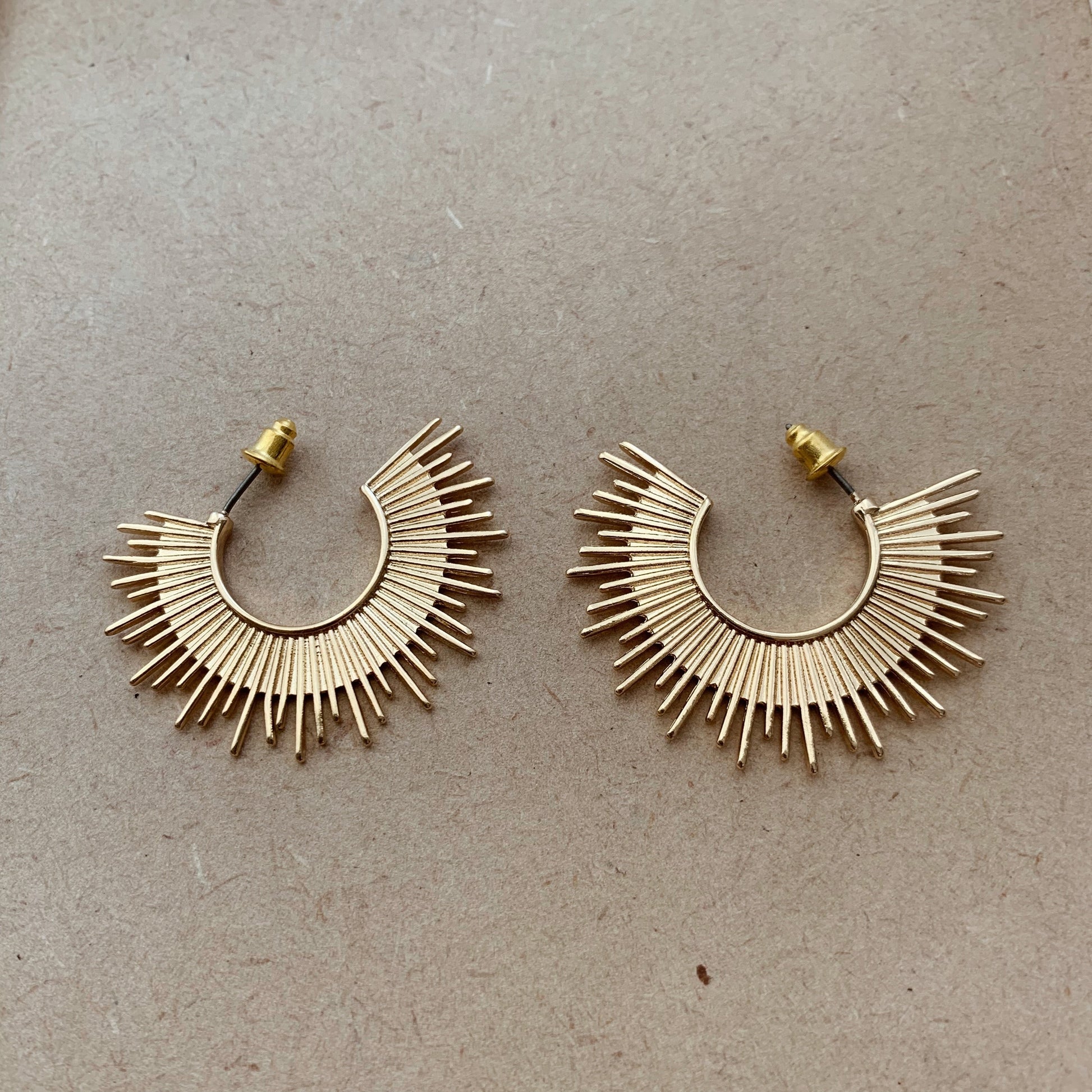 The Shani earrings by Kitsense are apart of the Statement Earring collection 0.5. This style features a 3/4 circle design with spike detail around the outside which makes for an eye-catching statement.