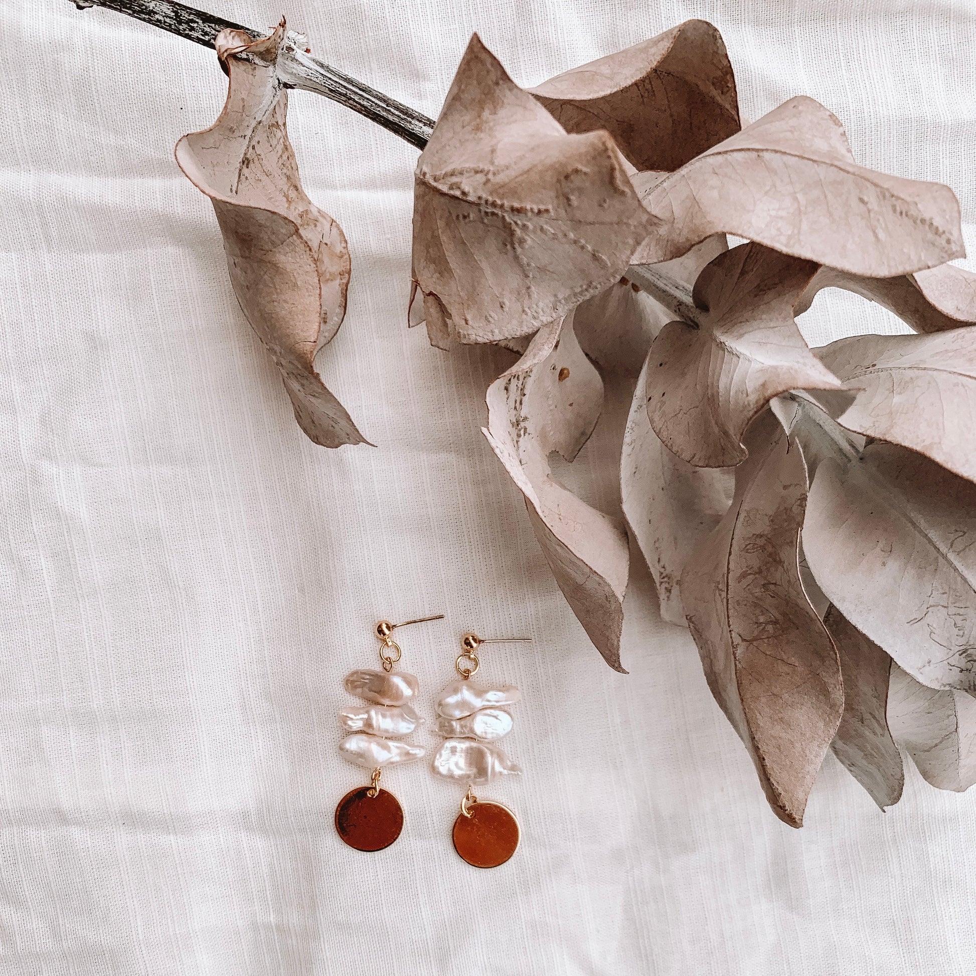 The Sierra earrings by Kitsense are apart of the Statement Earring collection 0.6. This style features stacked elongated baroque style pearls dropping down into a hanging gold-tone circle