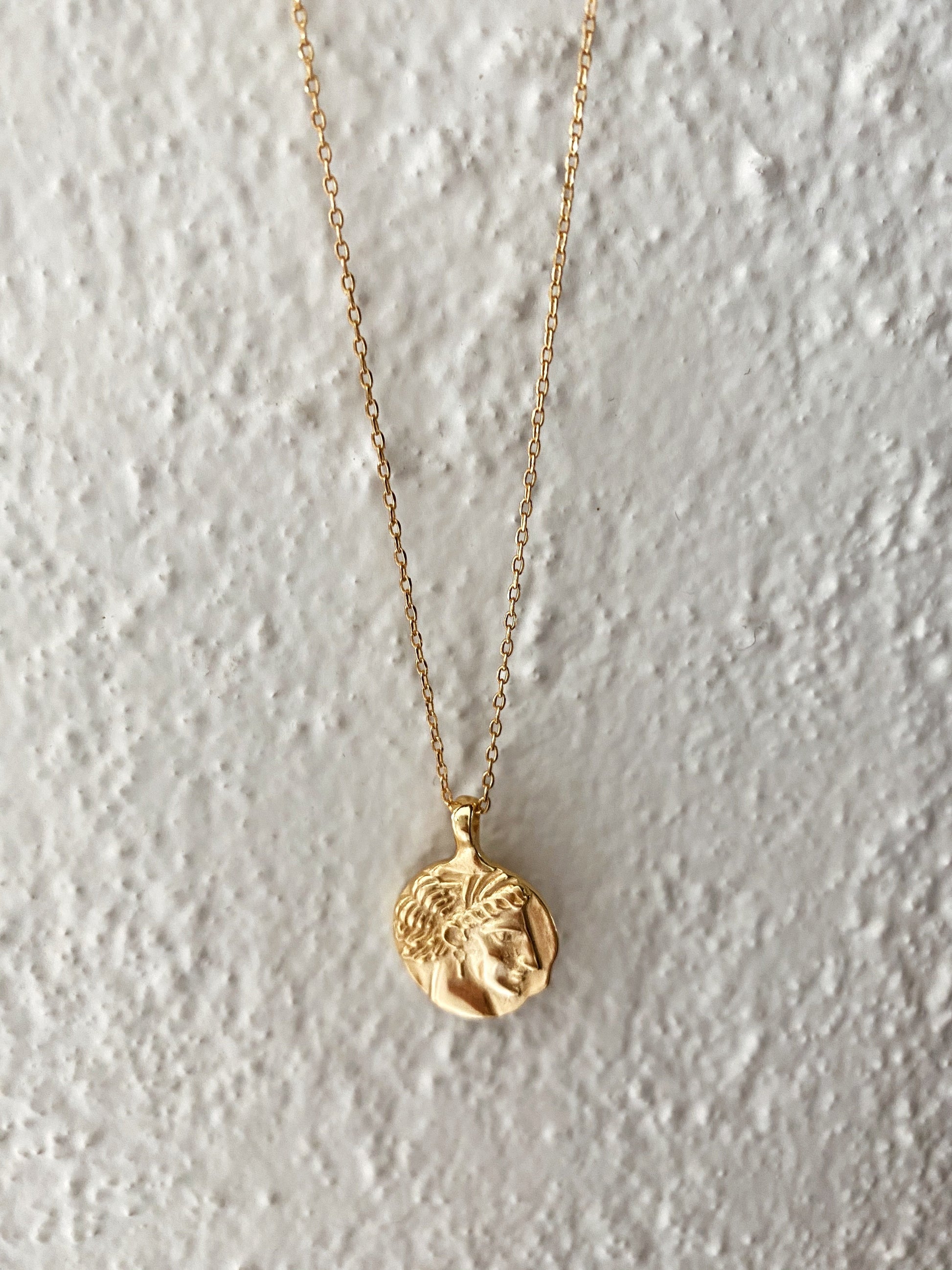 The Spartan Coin Necklace by Kitsense is a part of the 14k 925 Collection 0.6. This style features a circular pendant with a Spartan face detail.