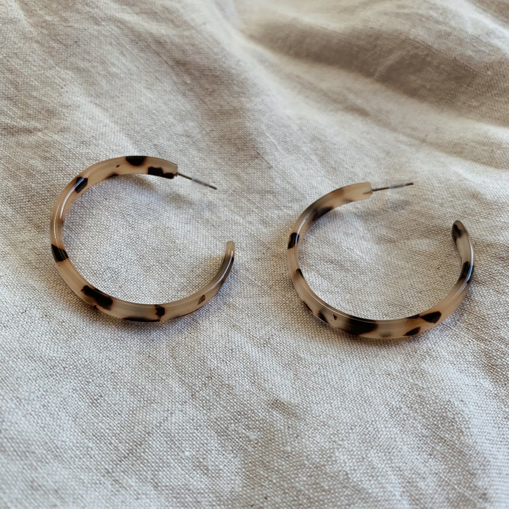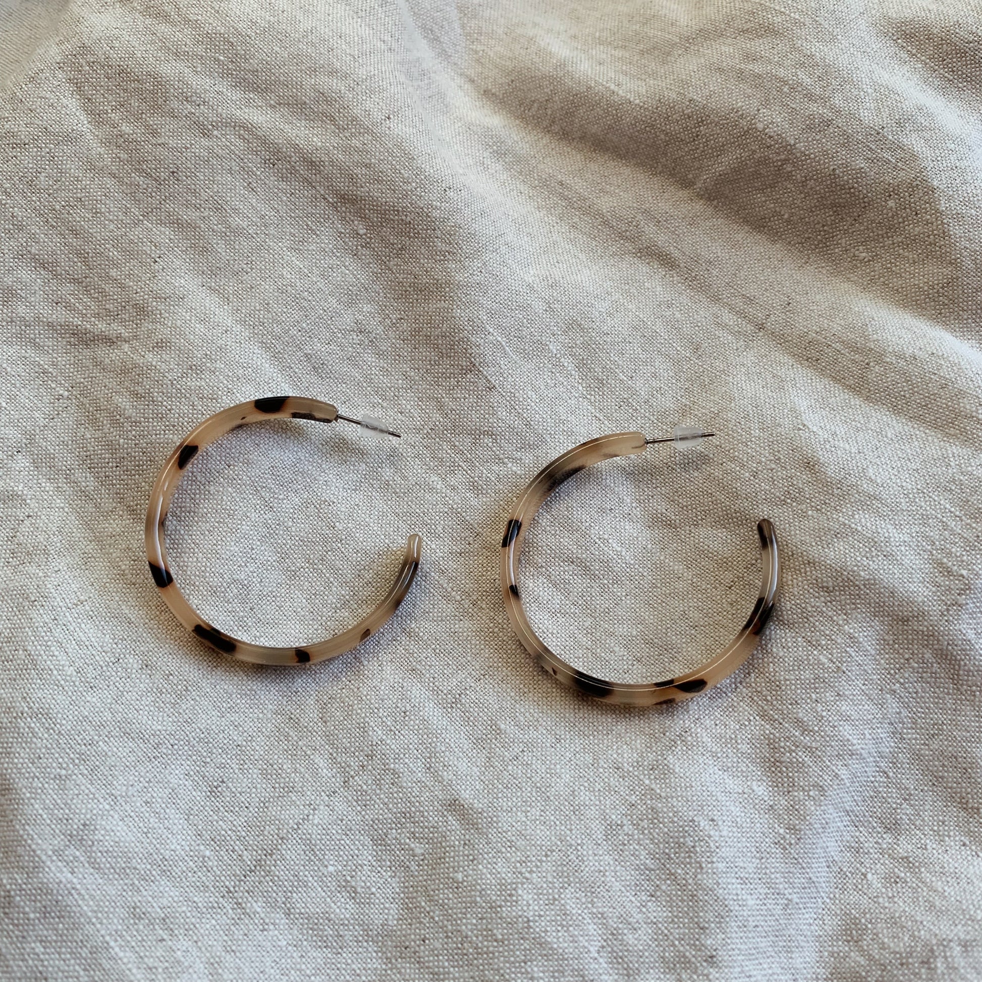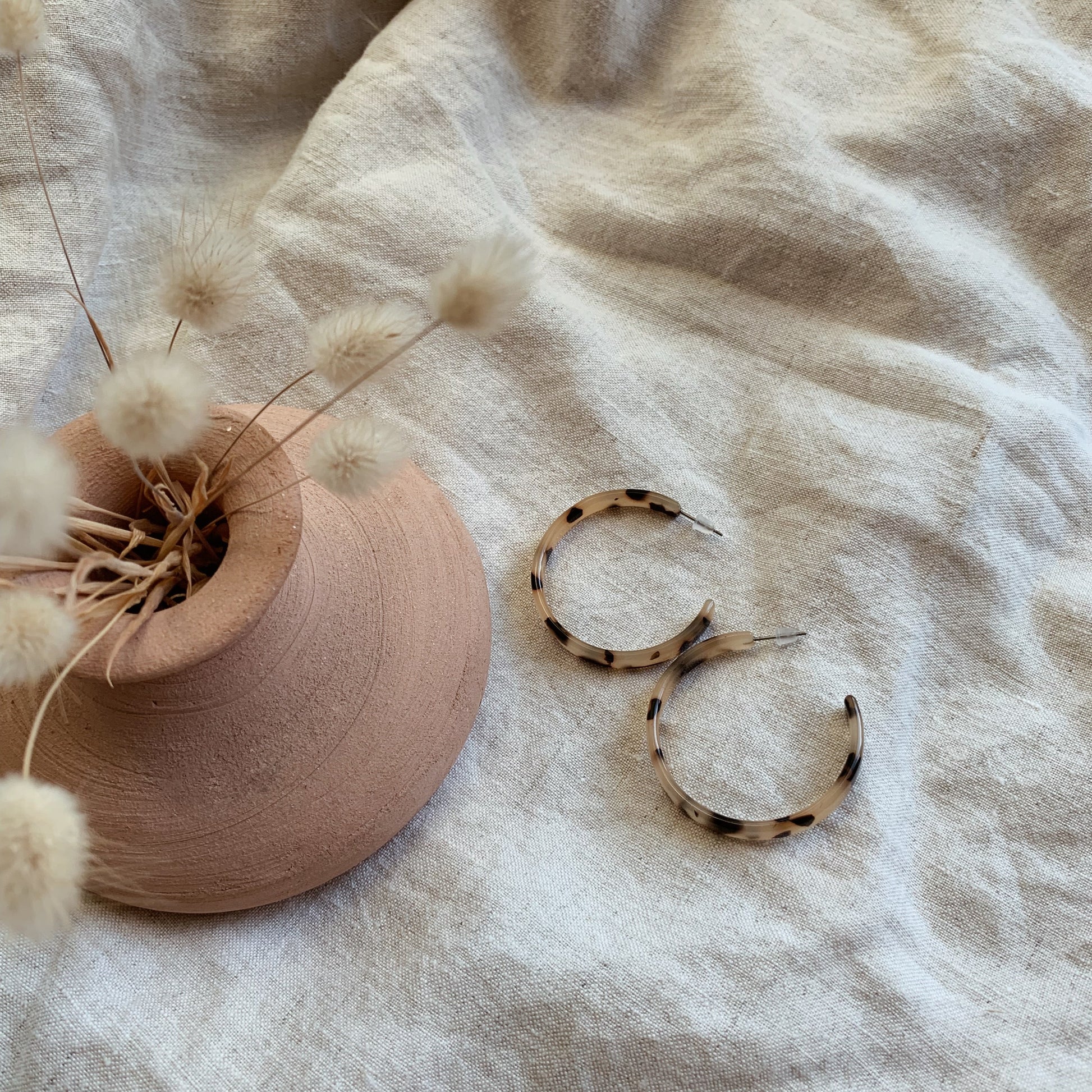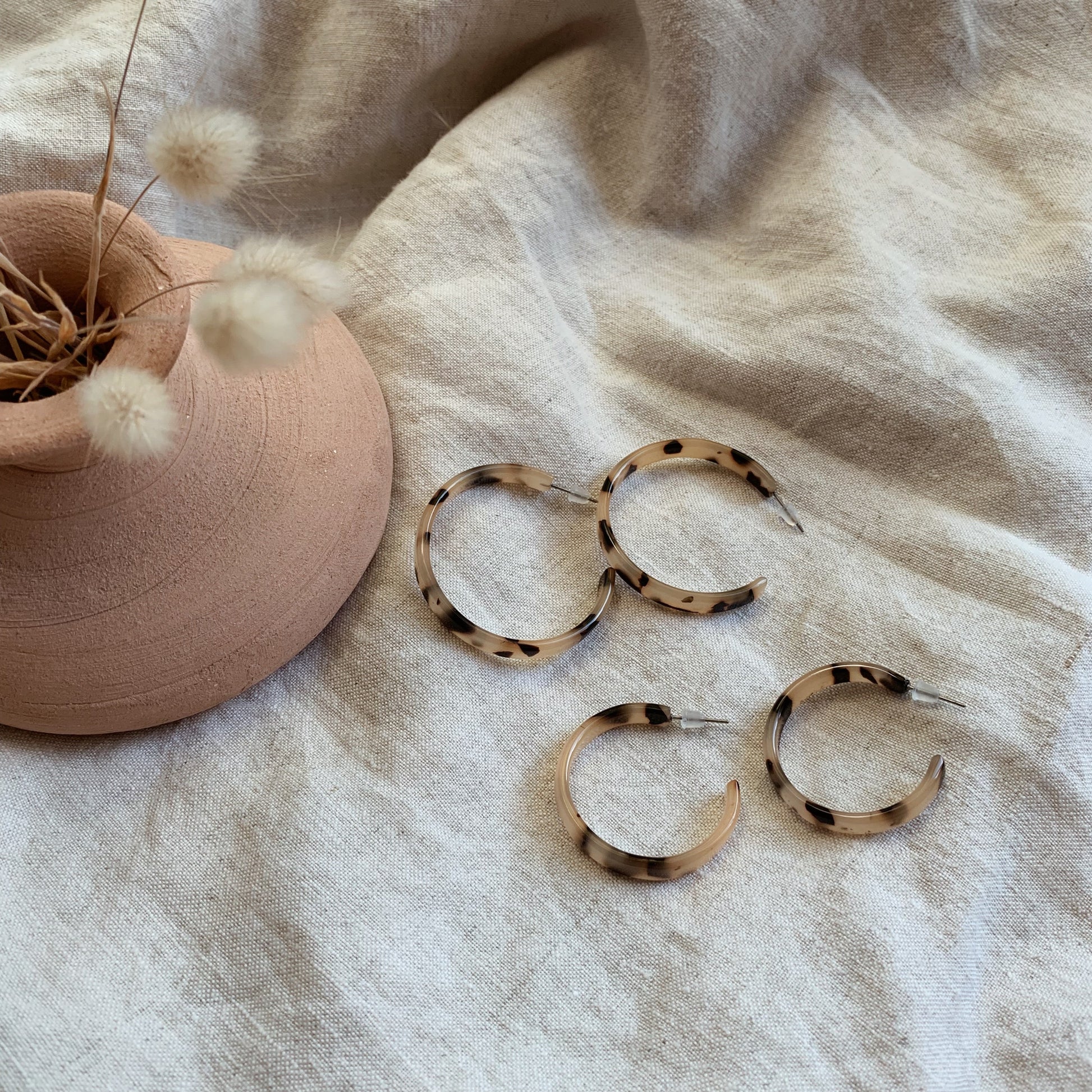 The Taylor Acetate Earrings by Kitsense are part of the Acetate Collection 0.3. This style is a hoop design in a tortoiseshell colour way available in a small or large size. The small size is the perfect subtle but interesting style for everyday looks and the large size is a statement to take from day to night.